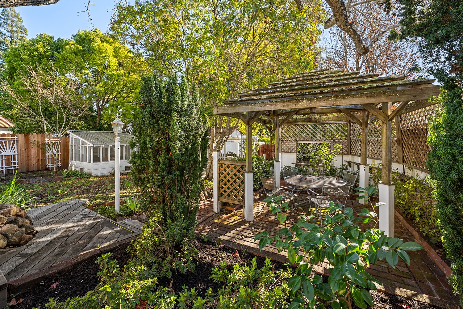The property offers flexible living with a walk-out bonus basement area ideal for arts, crafts, or creative space, along with laundry. Outdoor living shines with a rear deck overlooking a lush yard filled with established ornamental and fruit trees, plus a glass greenhouse for gardening enthusiasts. A detached one-car garage with workshop space provides room for projects, storage, or hobbies. A detached one-car garage with workshop space provides room for projects, storage, hobbies, or an ADU conversion.